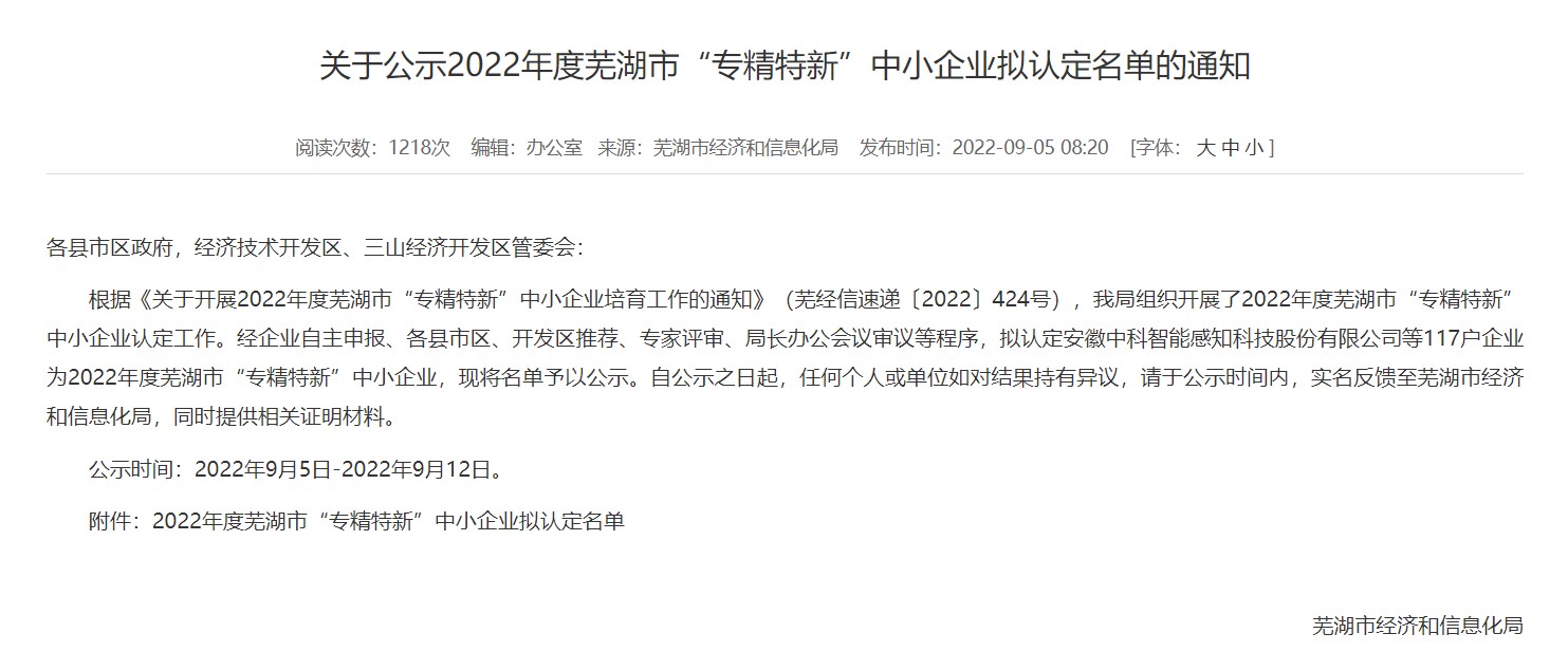 9月5日,芜湖市经信局公布了 2022年度芜湖市“专精特新”中小企业认定名单,经过7天的公示期,安徽中欧体育信息技术有限公司等117家企业被认定为2022年度芜湖市“专精特新”中小企业。