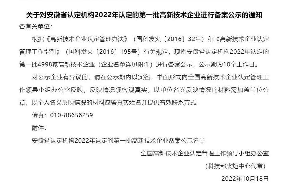 10月18日,安徽省认定机构对2022年认定的第一批高新技术企业进行了备案公示。安徽中欧体育信息继2016年,2019年,第三次被认定为